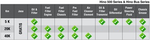 Ya, kami melanjutkan program servis gratis 2 tahun ini dengan program Kontrak Service yang memudahkan konsument dalam merawat kendaraan Hino.